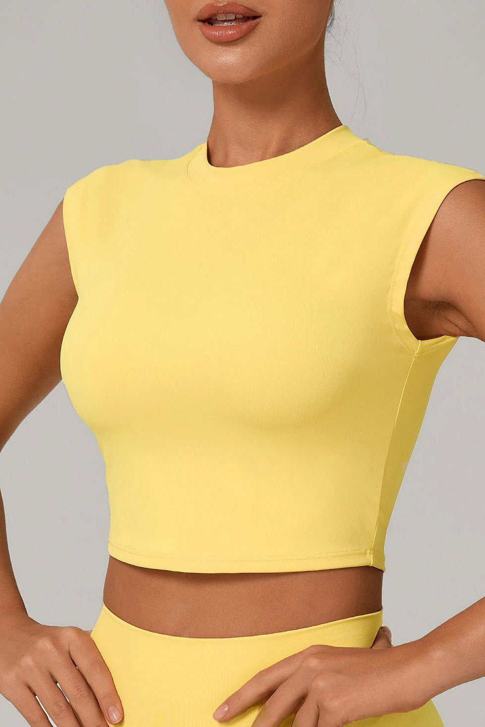 The cropped length pairs seamlessly with high-rise leggings or pants, offering a balanced look that feels both modern and versatile.