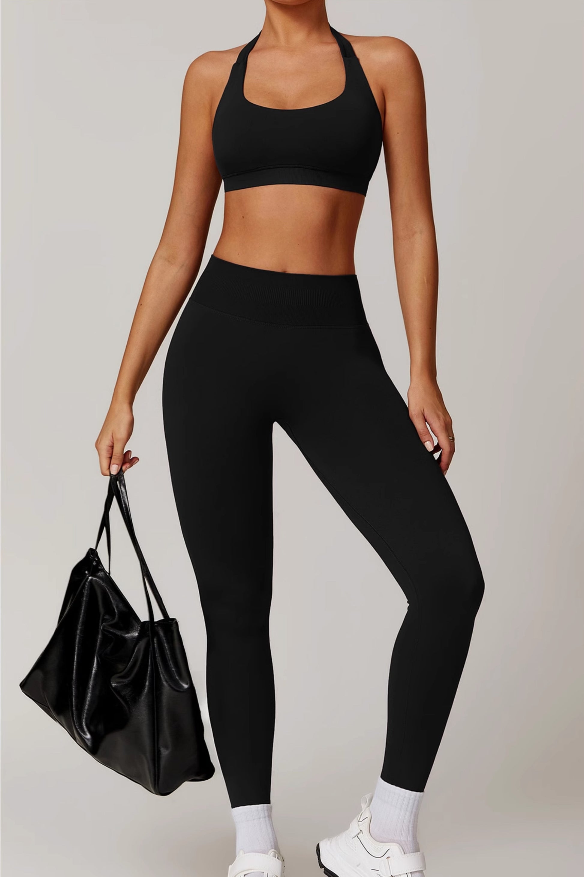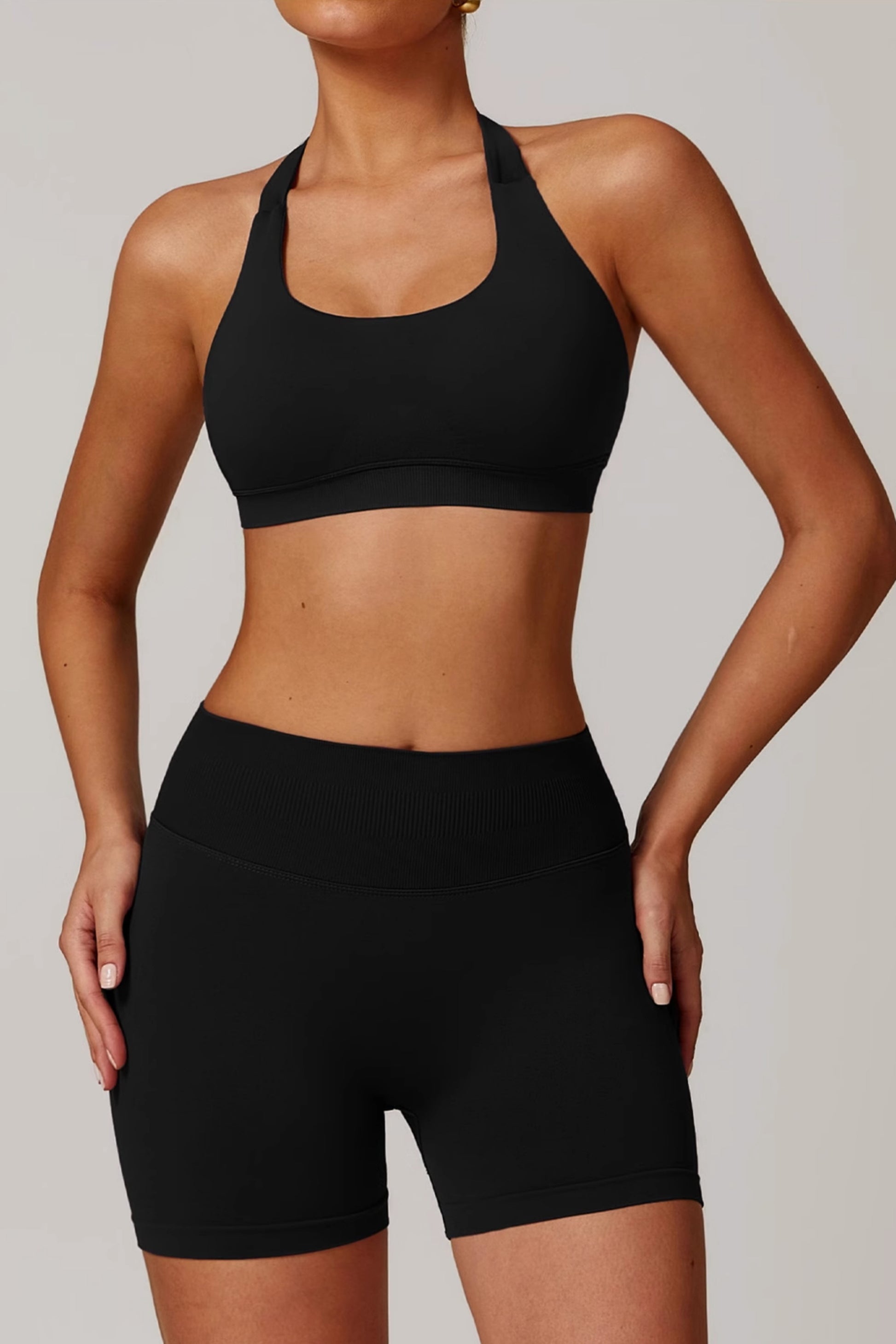 Open Back Halter — creates a clean, breathable silhouette while allowing full mobility